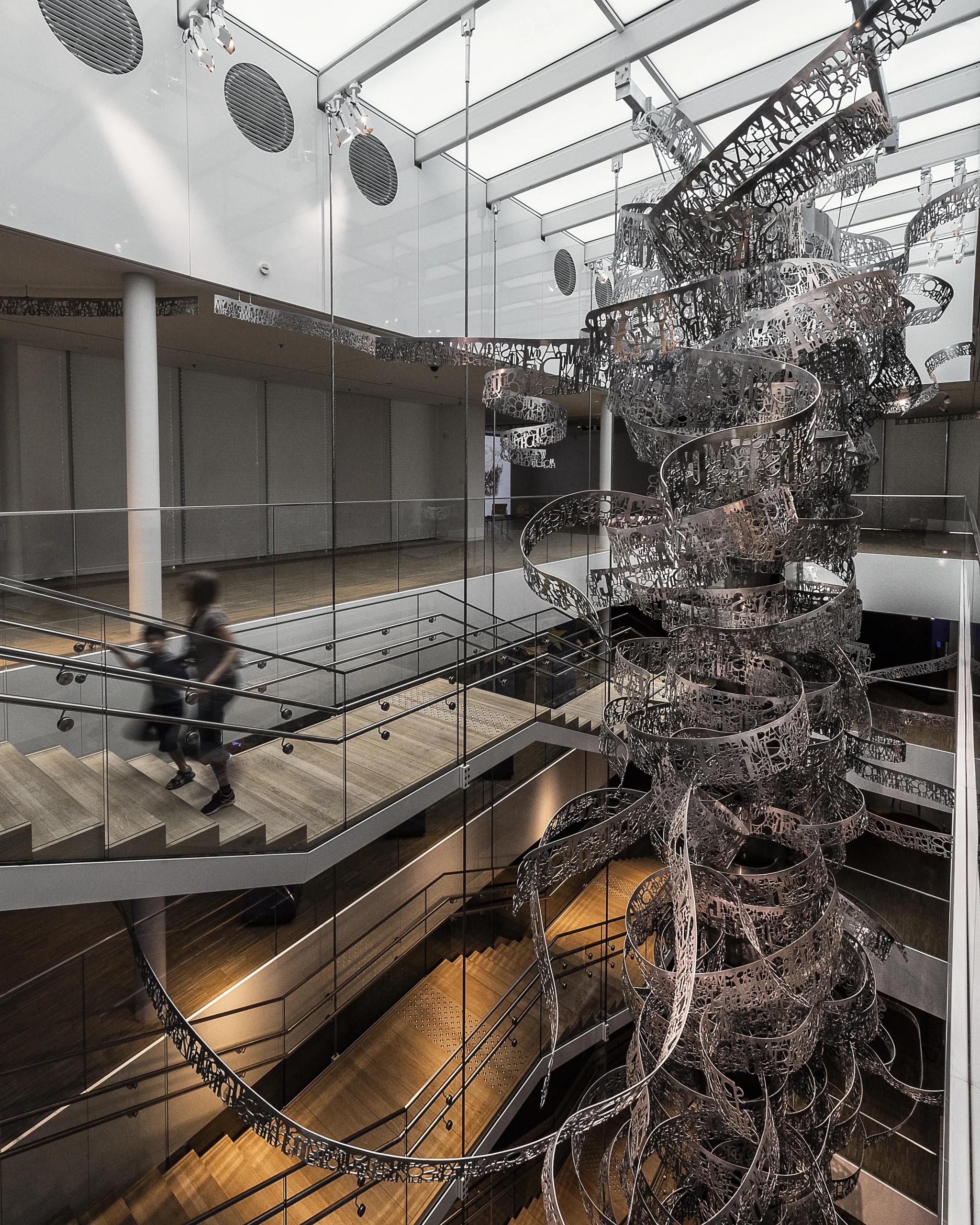 Nos encargamos del diseño y la producción de la exposición permanente. Mediante el empleo de tecnología audiovisual de última generación, junto a una gran variedad de textos, recursos gráficos, buscamos atraer a los visitantes con un enfoque educativo. El diseño del “Vórtice de la Historia”, una instalación metálica de 25 metros de altura hecha de aleación de aluminio y magnesio y acero, abarca seis plantas y representa el dinamismo de la historia europea y sus interpretaciones en constante cambio. De cerca, el vórtice se comporta como un elemento orgánico y vivo que flota bajo el lucernario, acompañando al visitante a lo largo de toda la visita.