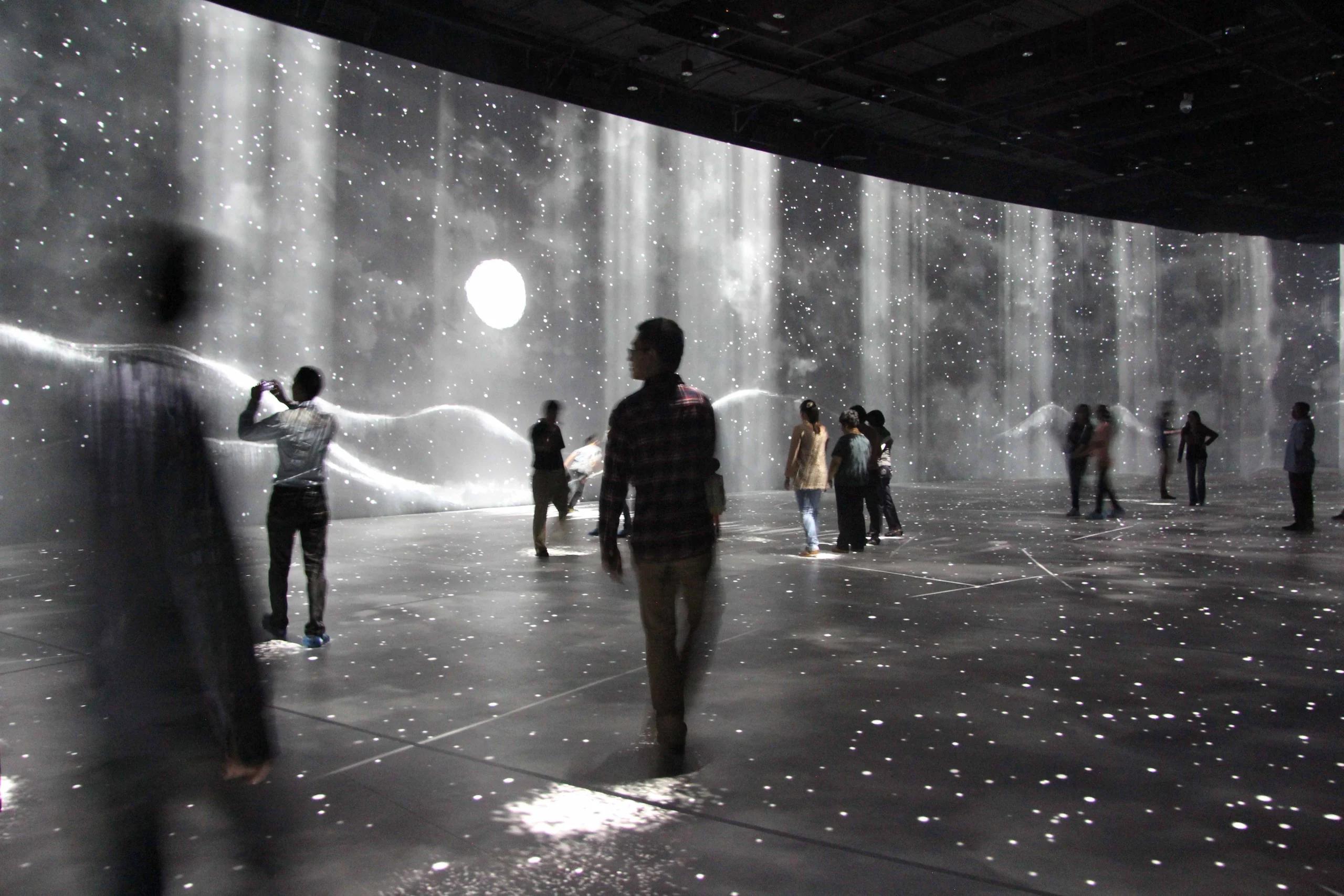 We crafted a monumental AV experience at a total 650 m2 with 22 high resolution projectors. The interactive floor occupies a space of 400 m2 while the interactive screen measures at 250 m2. Within this theater, visitors immerse themselves in an epic 15 minute tale on the rise of the Kingdom of Wu. It acts as a time capsule, transporting the visitor to experience the trials and tribulations of a kingdom through cinematic martial arts and painted scenes. We did not want the visitor to idly observe the story but to take part in it. With the installed motion tracking cameras, visitors can move around and shape the various projected landscapes.